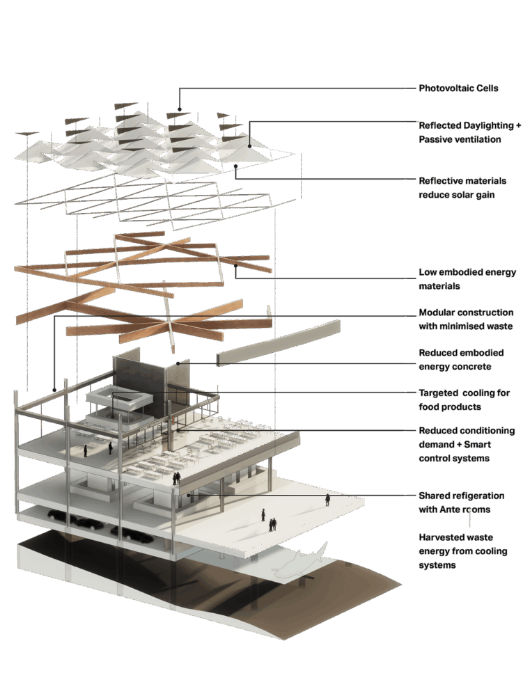 Новый рыбный рынок в Сиднее максимально использует потенциал возобновляемых источников энергии, используя инновационные методы сокращения потребления и переработки энергии. Интегрированная и специализированная система рекуперации и повторного использования источников тепла и холода обеспечит абсолютный минимум капитальных затрат на энергию для достижения целевых показателей выбросов и экономии средств на этапе строительства и эксплуатации.