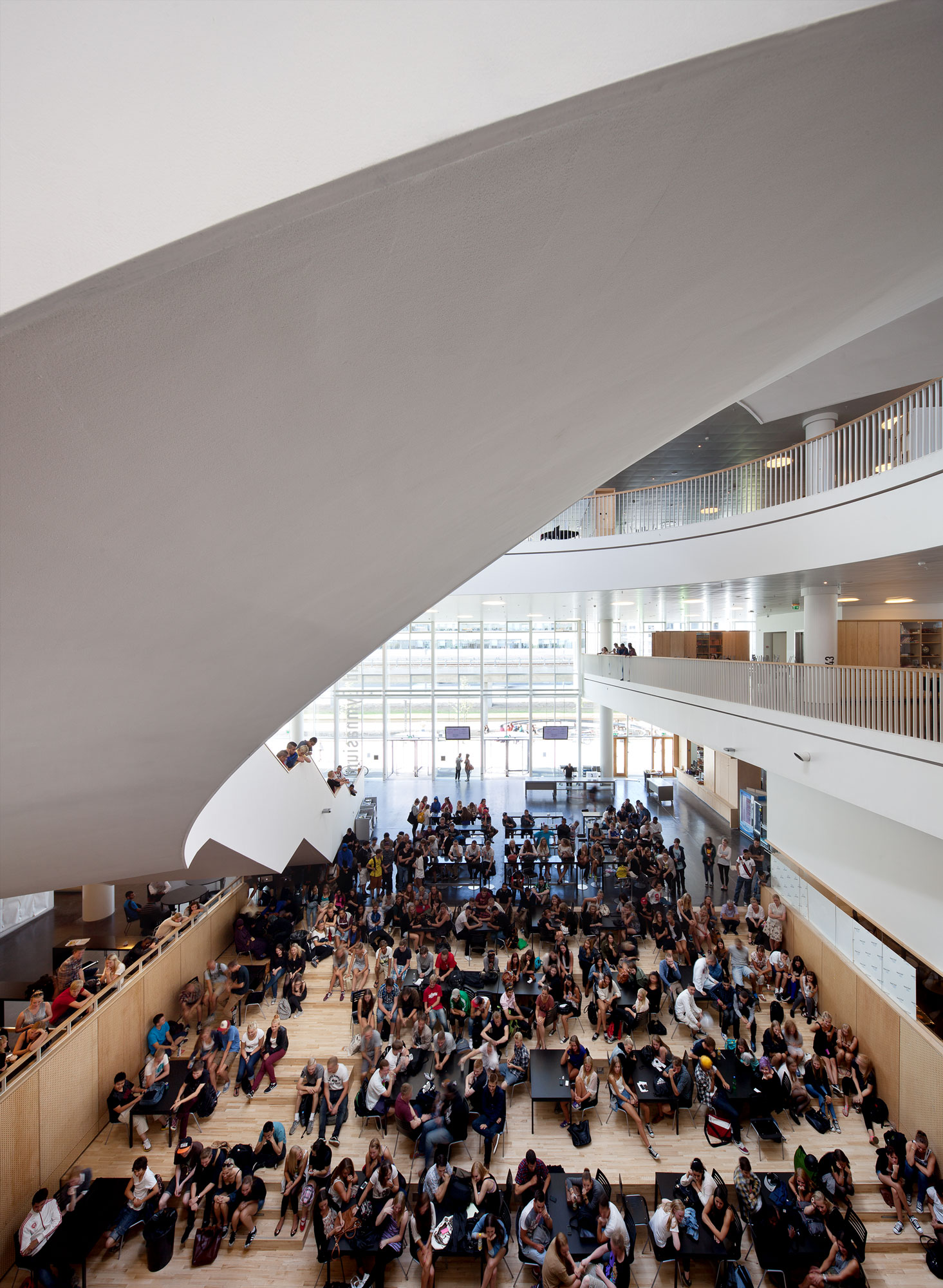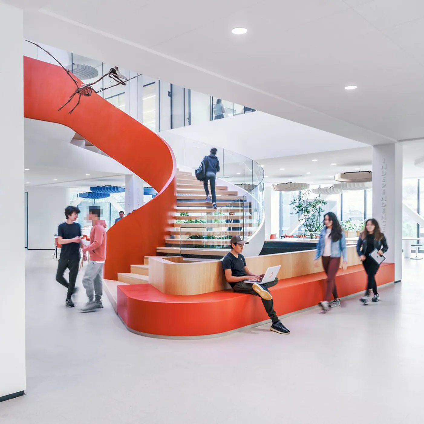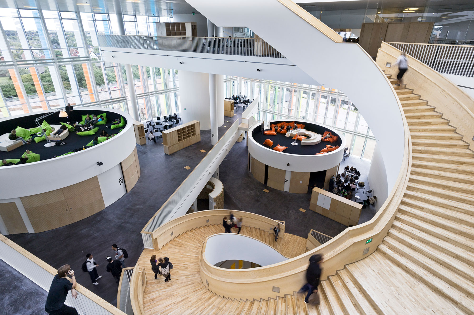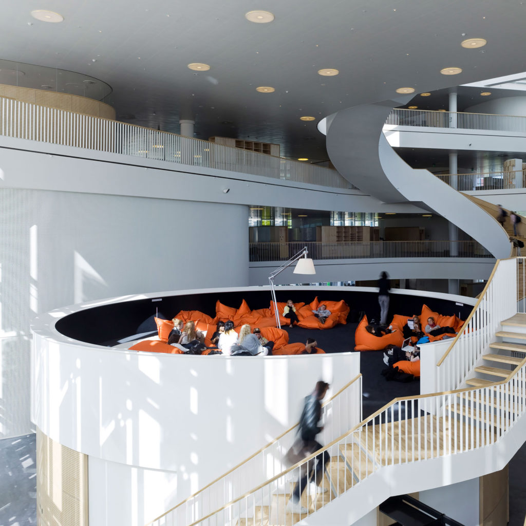 На изображениях ниже представлена Ørestad Gymnasium (Гимназия Орестад) от архбюро «3XN«— Копенгаген, Дания. Проект завершен в 2007 году (дополнительные проектные работы в 2017 году). Концепция: Школа-коворкинг или «Школа без стен». Здание представляет собой одно огромное, открытое, четырехэтажное пространство, где нет традиционных классов. Учебные зоны базируются вокруг главного атриума и гигантской спиральной лестницы, которая является центральным местом встреч, общения и обучения. Ученики проводят около 50% времени в открытых, гибких зонах, что стимулирует совместную работу и проектное мышление. Архитектура активно формирует поведение. Отсутствие стен и коридоров повышает креативность и позволяет максимально эффективно использовать каждый квадратный метр.