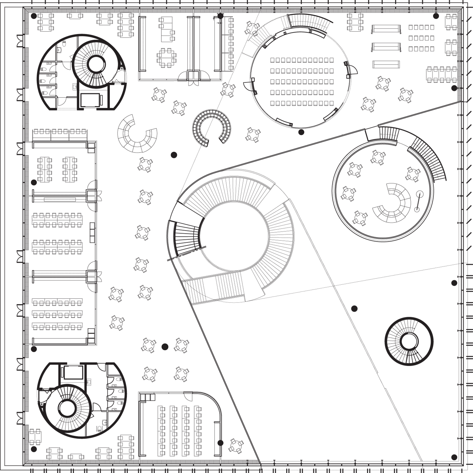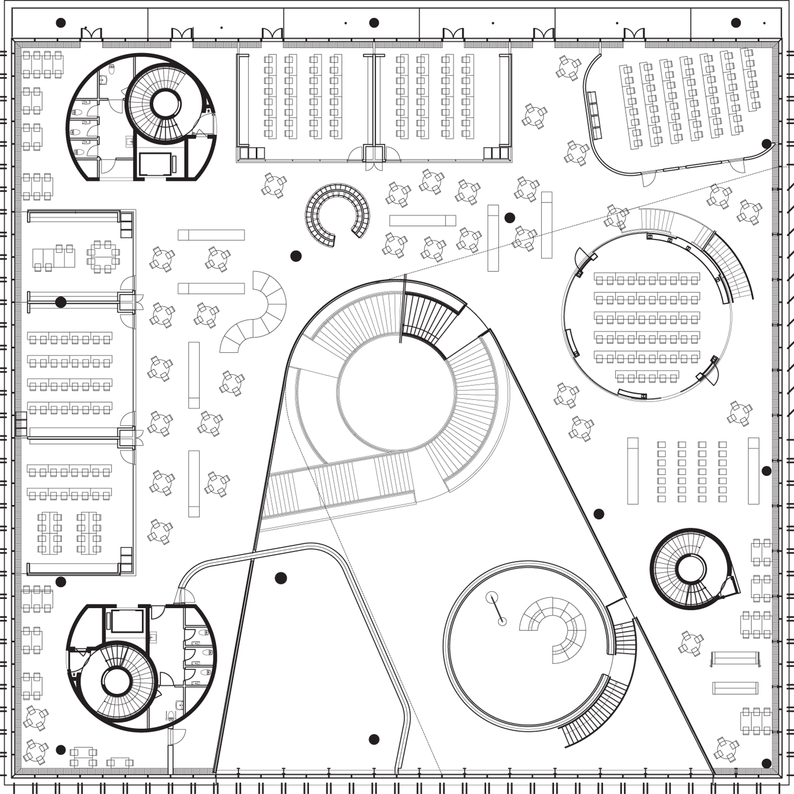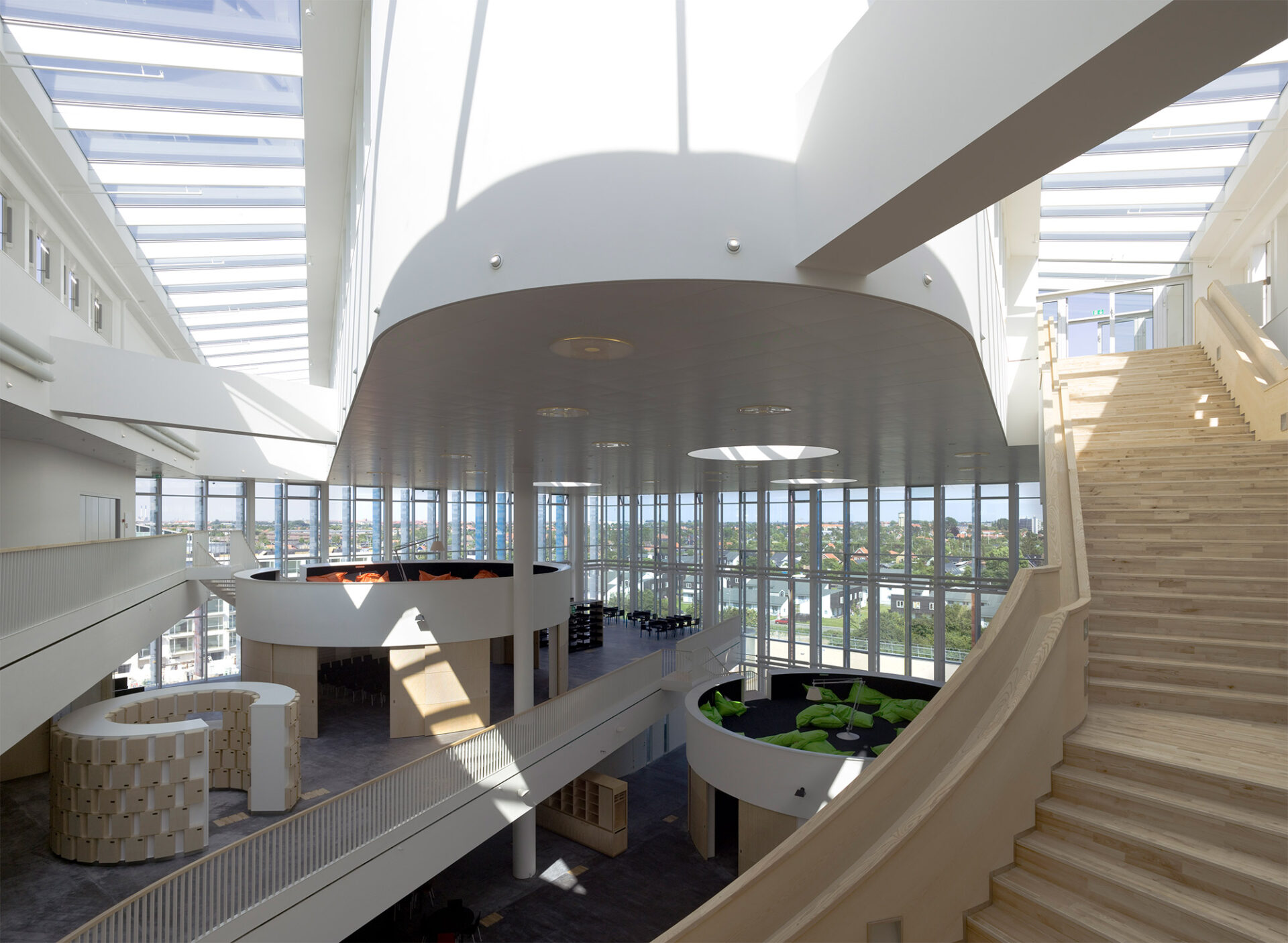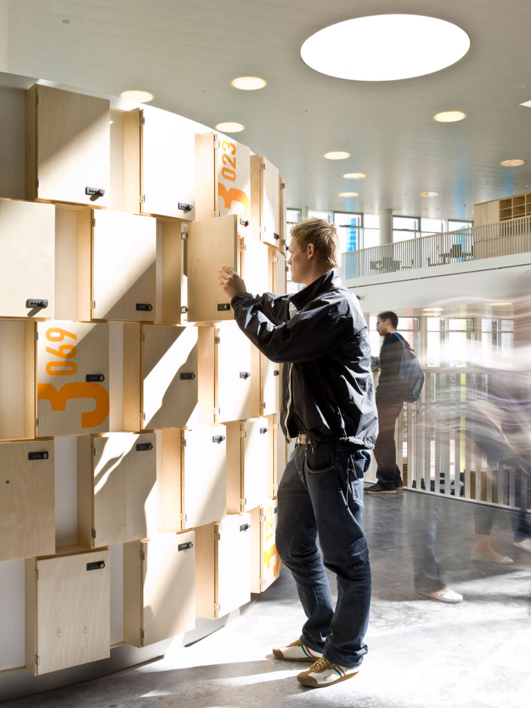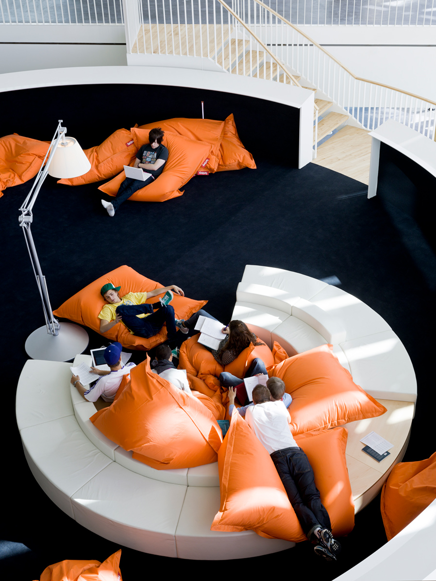 На изображениях ниже представлена Ørestad Gymnasium (Гимназия Орестад) от архбюро «3XN«— Копенгаген, Дания. Проект завершен в 2007 году (дополнительные проектные работы в 2017 году). Концепция: Школа-коворкинг или «Школа без стен». Здание представляет собой одно огромное, открытое, четырехэтажное пространство, где нет традиционных классов. Учебные зоны базируются вокруг главного атриума и гигантской спиральной лестницы, которая является центральным местом встреч, общения и обучения. Ученики проводят около 50% времени в открытых, гибких зонах, что стимулирует совместную работу и проектное мышление. Архитектура активно формирует поведение. Отсутствие стен и коридоров повышает креативность и позволяет максимально эффективно использовать каждый квадратный метр.