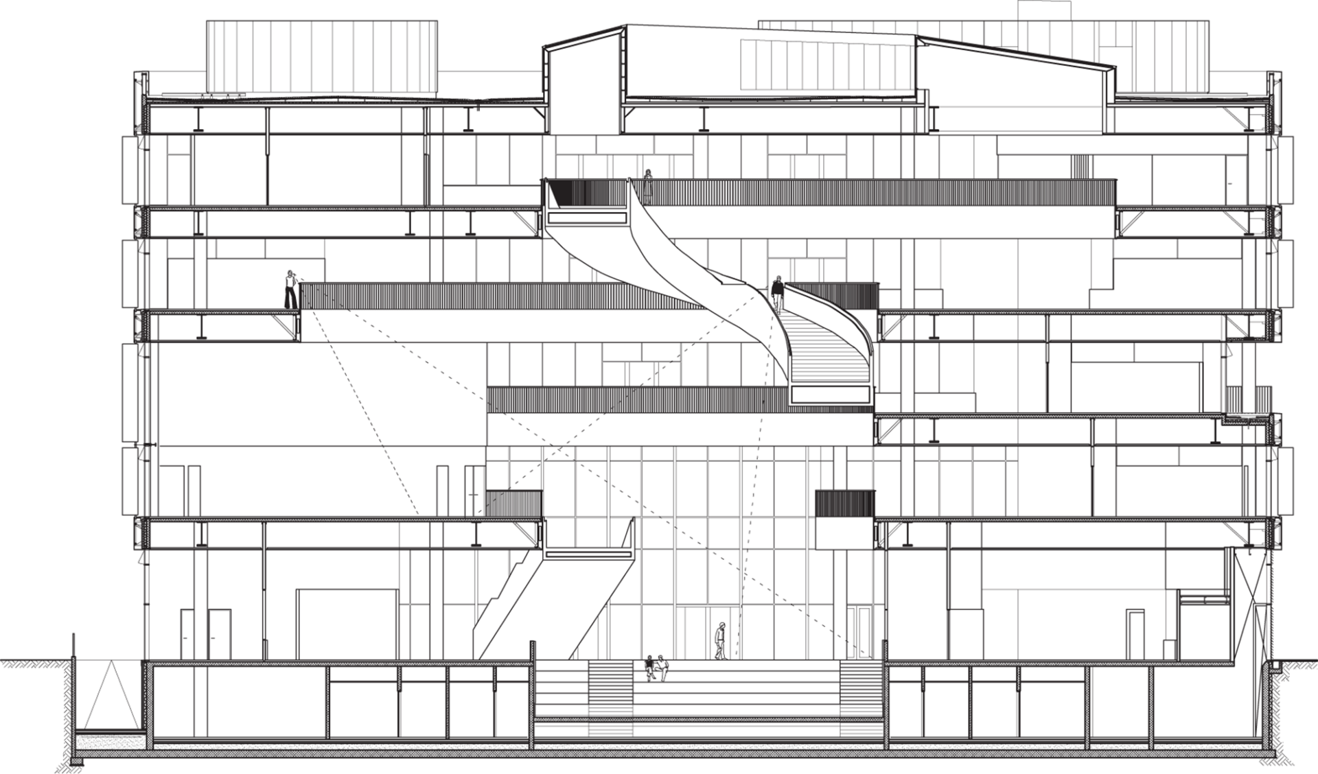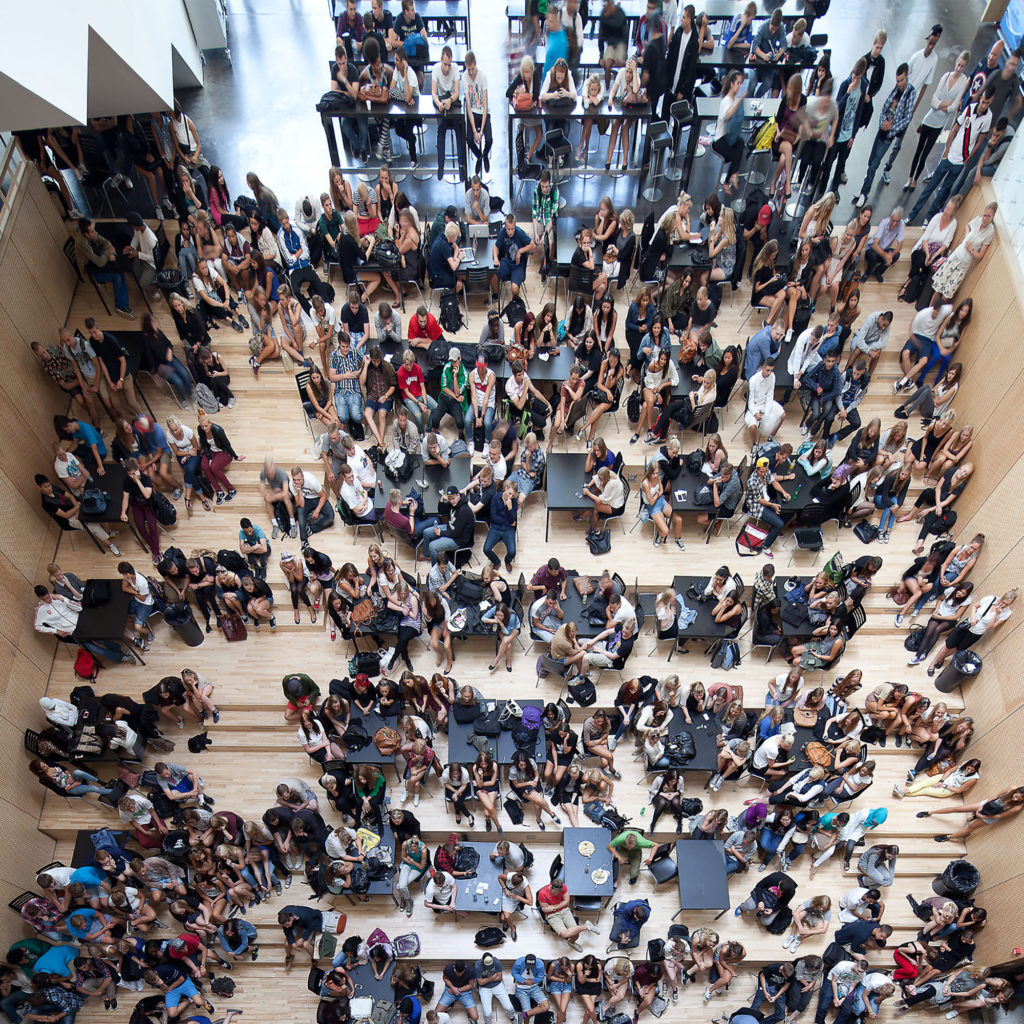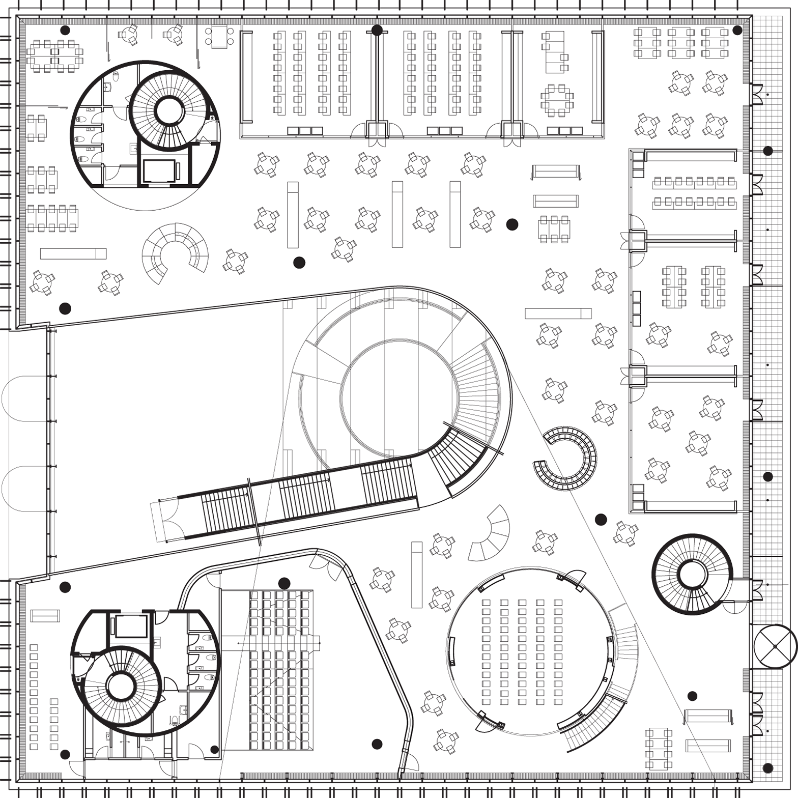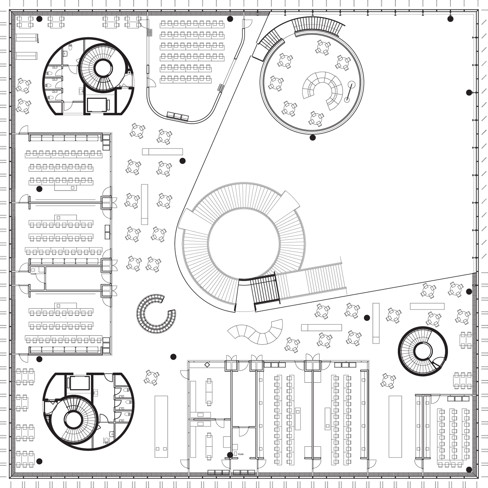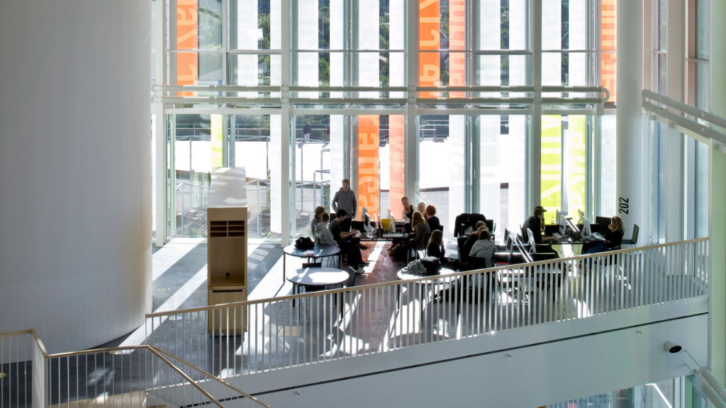 На изображениях ниже представлена Ørestad Gymnasium (Гимназия Орестад) от архбюро «3XN«— Копенгаген, Дания. Проект завершен в 2007 году (дополнительные проектные работы в 2017 году). Концепция: Школа-коворкинг или «Школа без стен». Здание представляет собой одно огромное, открытое, четырехэтажное пространство, где нет традиционных классов. Учебные зоны базируются вокруг главного атриума и гигантской спиральной лестницы, которая является центральным местом встреч, общения и обучения. Ученики проводят около 50% времени в открытых, гибких зонах, что стимулирует совместную работу и проектное мышление. Архитектура активно формирует поведение. Отсутствие стен и коридоров повышает креативность и позволяет максимально эффективно использовать каждый квадратный метр.