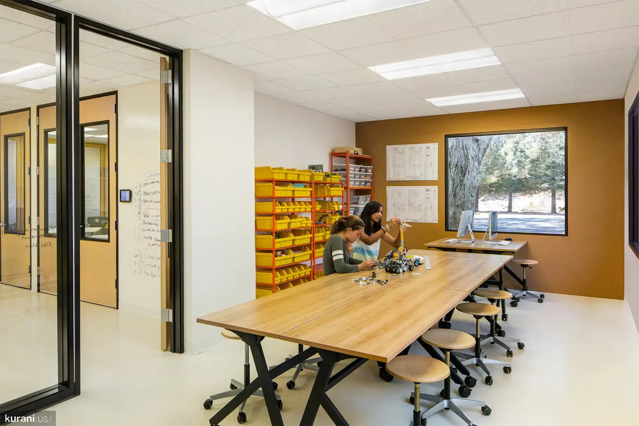 Другой пример Школа Khan Lab, открывшаяся в 2017 году, спроектированная и построенная архитектурным бюро Kurani , сочетает в себе традиционное обучение в классе с проектами, реализуемыми учениками. Этот подход радикально отличается от традиционного школьного образования и может проложить путь к школам будущего. Школа Khan Lab – это настоящая лаборатория для обучения. Здесь нет кабинетов истории или математики. Вместо этого школа построена вокруг различных способов обучения, поэтому при обновлении учебной программы преподавателям не нужно создавать ничего нового. Гибкая образовательная среда может адаптироваться к изменениям.